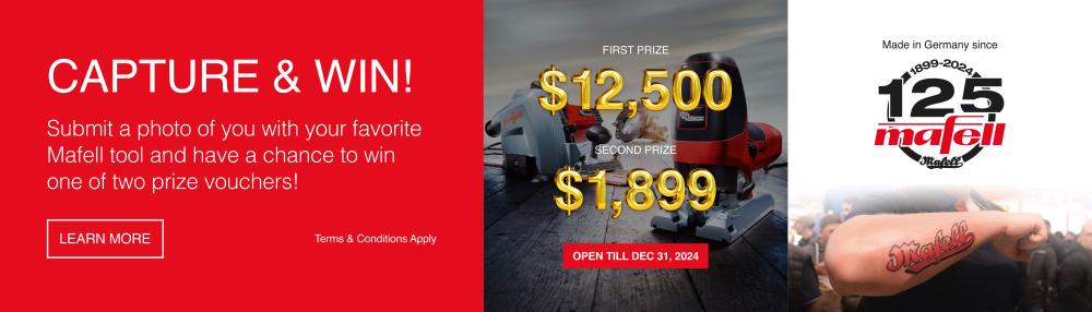 Click the Link above to submit a photo with your favorite Mafell tool: first prize wins $12,500 towards a purchase of Mafell tools next year (celebrating 125 years), and second prize wins $1,899 towards a purchase of Mafell tools next year (celebrating the founding in 1899). Our friends in Germany hope to do a livestream revealing the winners on social media next year. Looking forward to seeing your entries!